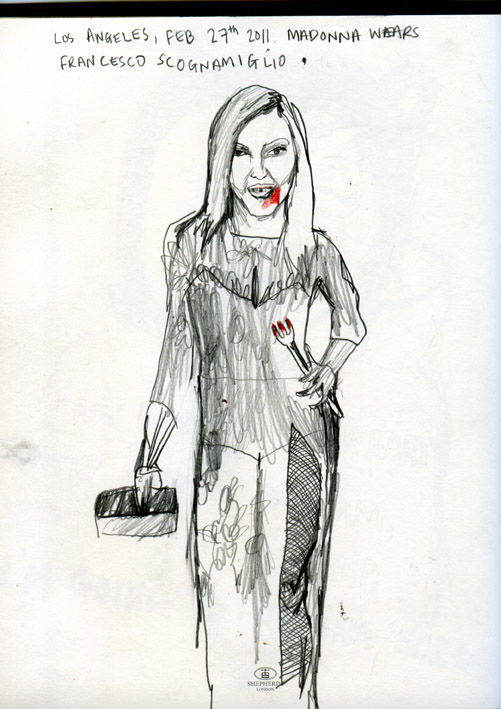 Madonna was seen leaving the Vanity Fair party with a bloodied fork in her hand. "I don't understand it" reported one waitress"the guests had cod for dinner". A waiter is still missing.