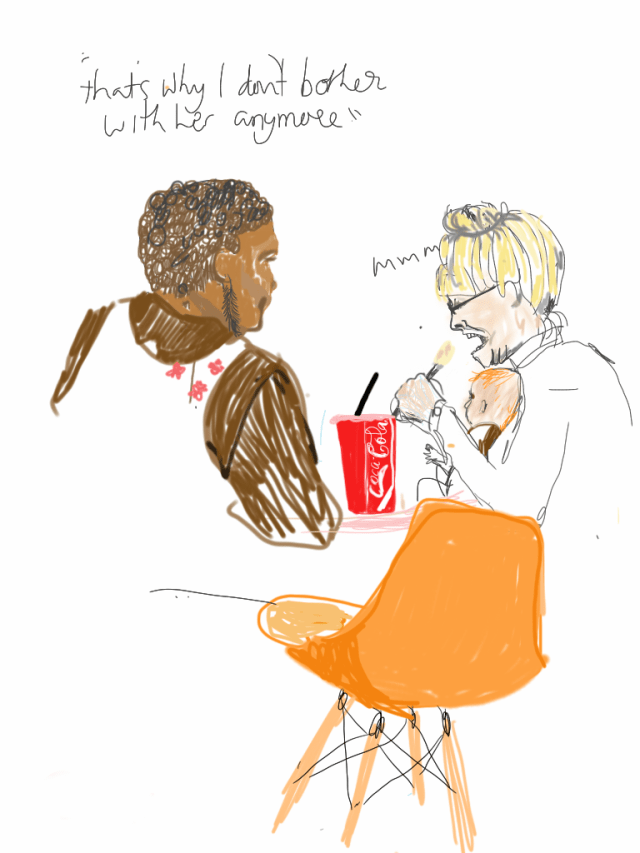Based on the saying “If you always do what you’ve always done, you’ll always get what you always got” I spent part of my day sitting in KFC today drawing people on my iPad. Neither of which I have ever done before. I now have indigestion and tired eyes, so it’s definately true.